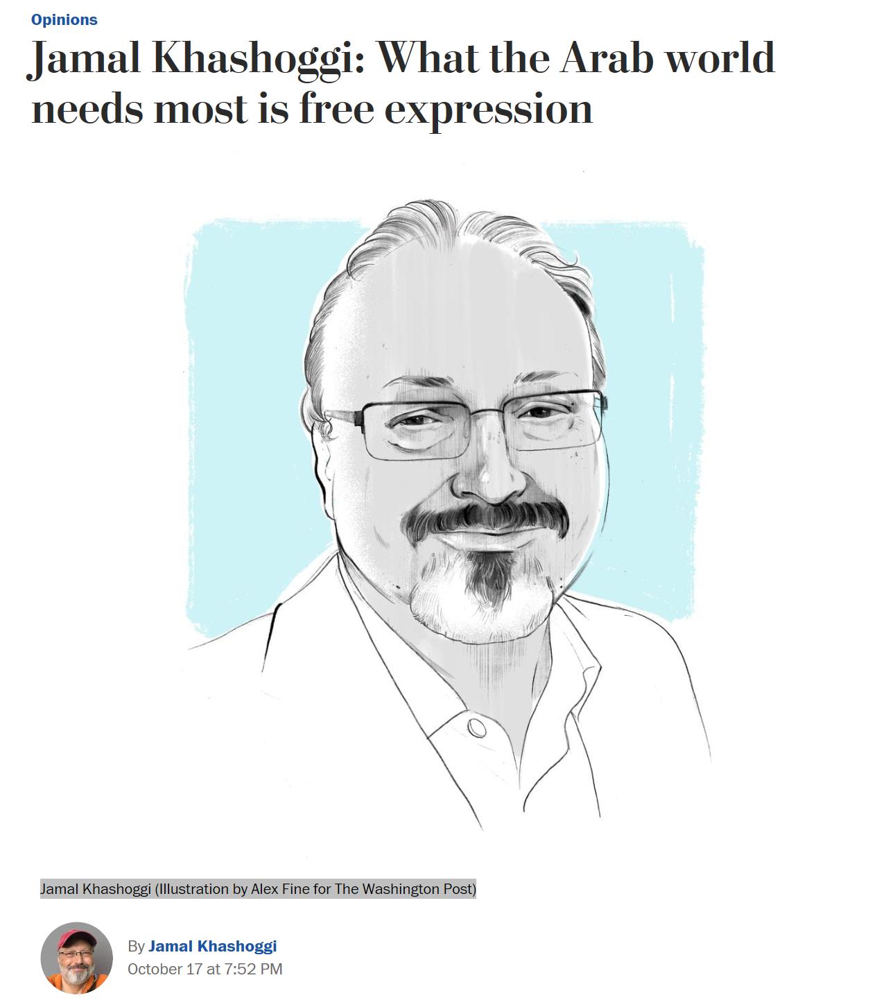 在卡舒吉最后的专栏中,《华盛顿邮报》环球评论编辑阿蒂亚(Karen Attiah)写道:“就在贾迈勒·卡舒吉于伊斯坦布尔失踪次日,我从他的翻译及助理那里得到了这篇专栏。但《华盛顿邮报》决定暂不发表,因为我们仍然希望贾迈勒回到我们身边,我们还可以一起编辑这篇文章。”