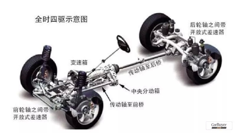全时四驱是所有四驱系统中成本最高的一种,它的特点是:结构复杂、性能可靠、非极限路面应付自如。