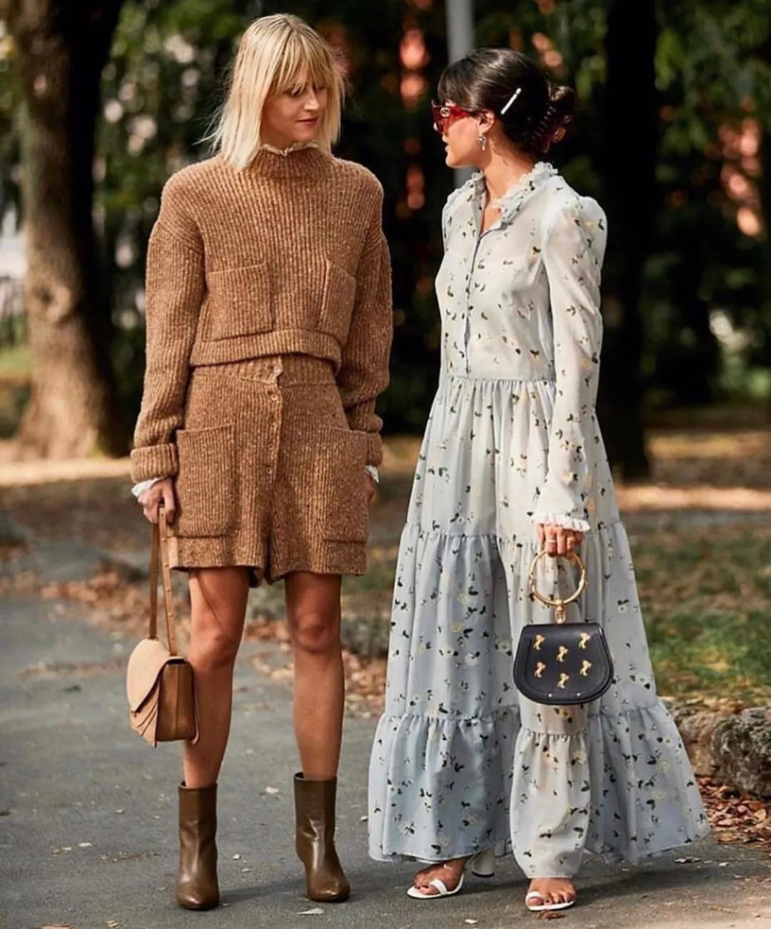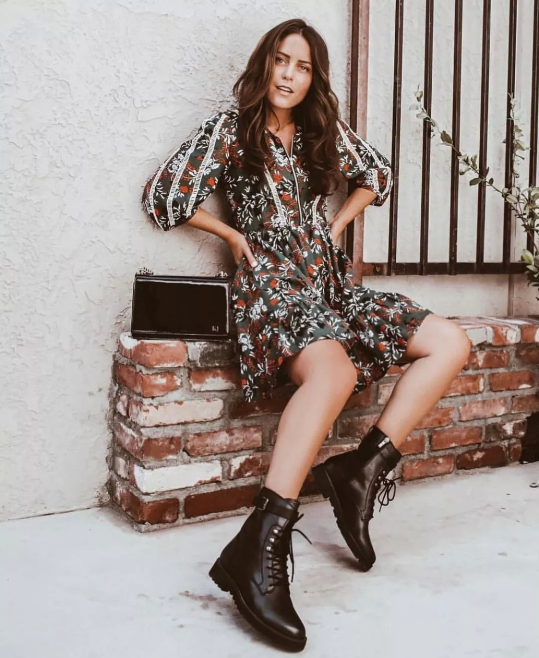 我研究了很多搭配之后发现,简单的基础款鞋子,譬如黑色的靴子、小白鞋,最能够突出印花连衣裙本身的质感。