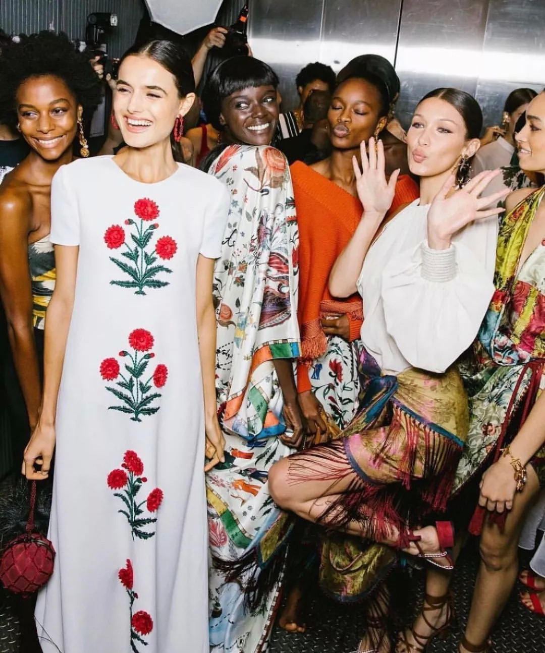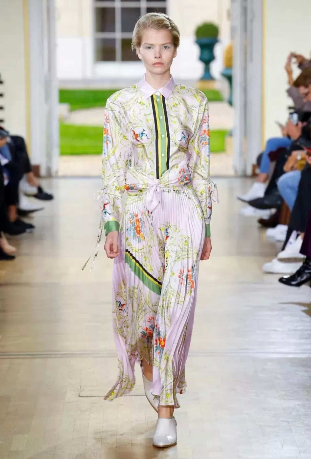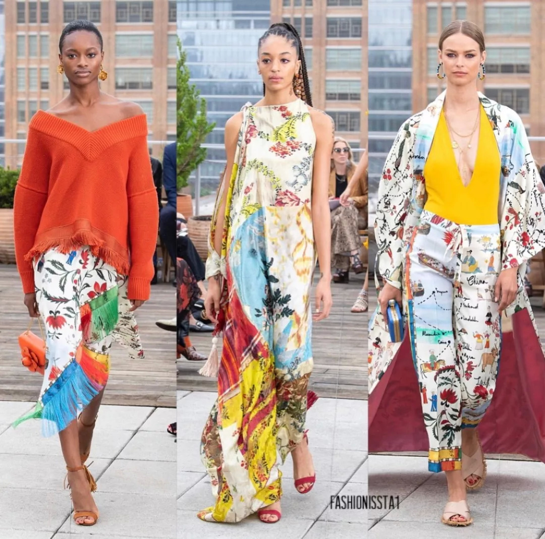 但是,一反杨幂穿的搞定礼服的简约风格,Oscar de La renta的2019春夏成衣,充满了波西米亚印花,因为设计灵感来源于设计师Laura Kim与Fernando Garcia的夏日旅程。