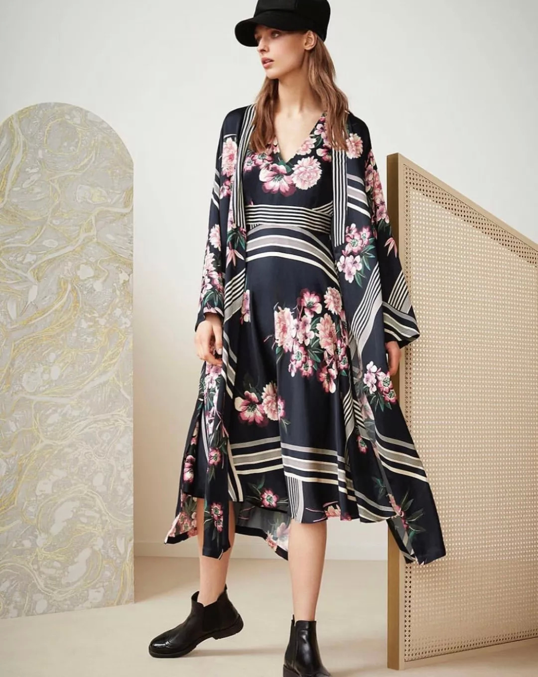 听说有些地方早已经入秋,而且还准备入冬了。没关系,在大家都换上黑白灰无聊三件套的时候,你穿上印花连衣裙套再上一件风衣或者西装,还是可以做你们办公室里行走的花园。