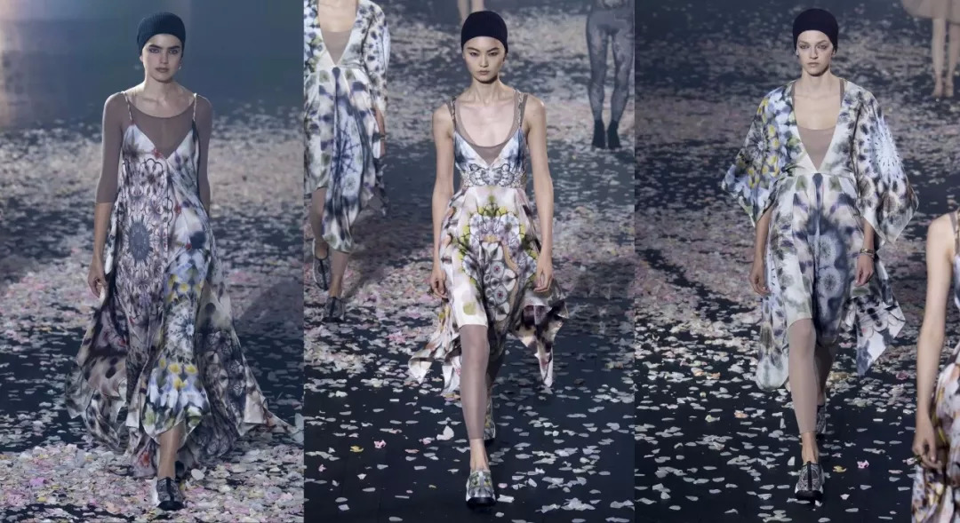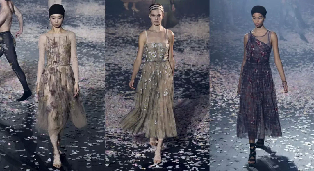 秀场上不仅有穿着印花裙、纱裙的仙女,天上还下着花瓣雨,满地都是花瓣。