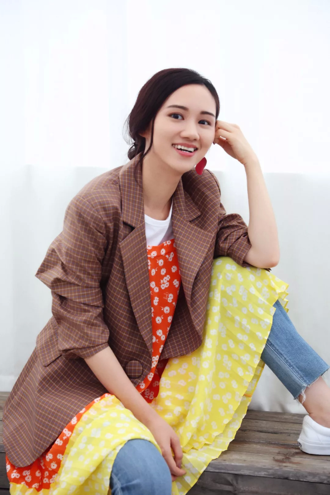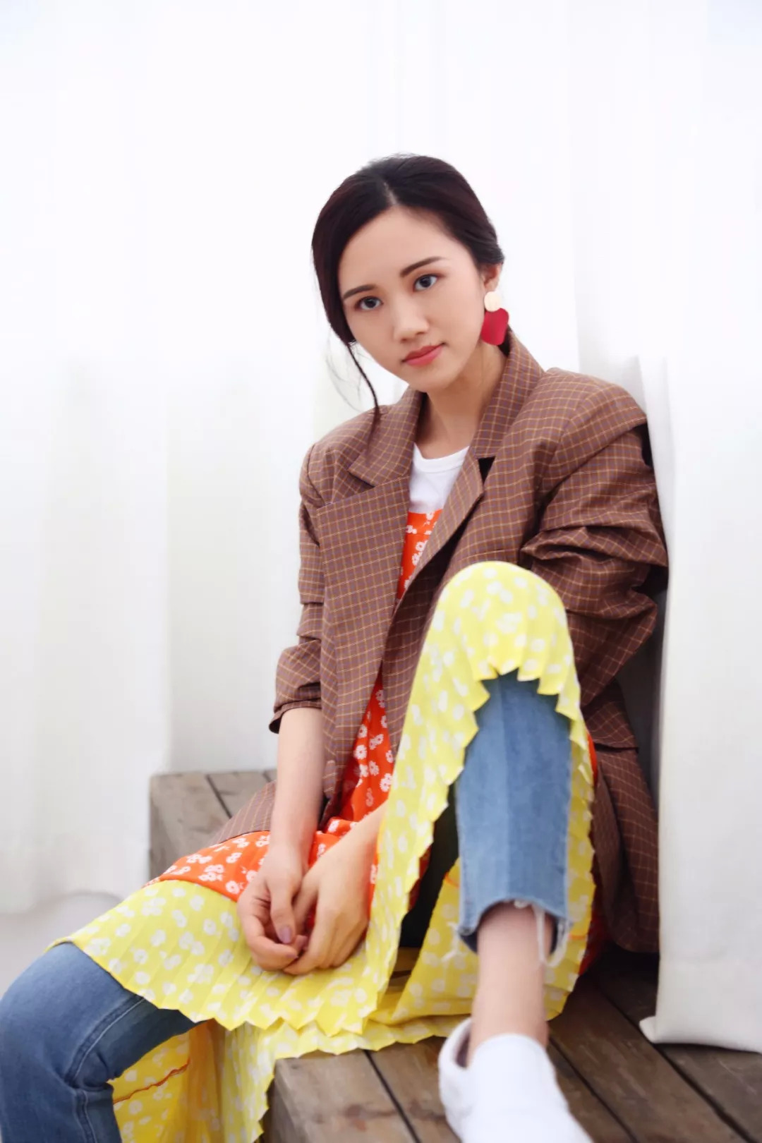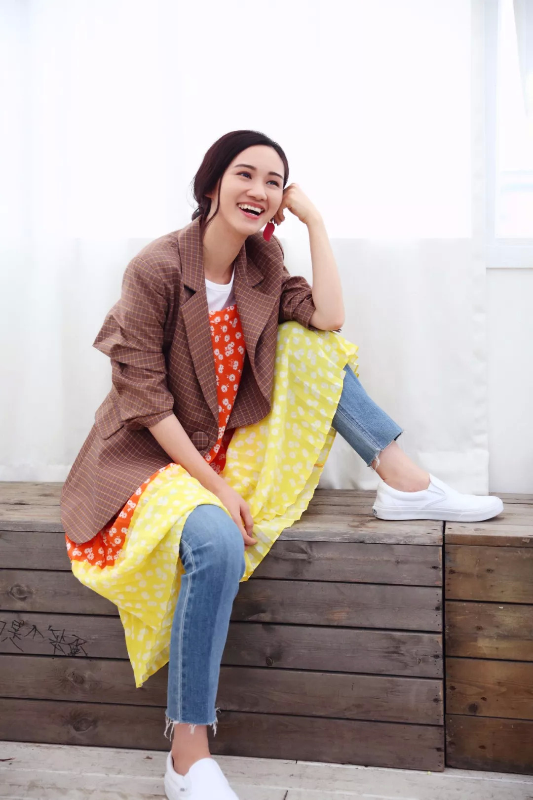 她将纱裙、印花裙和小西装、皮带相搭配,既有女强人、独立的一面,又有女人味、温柔的一面。