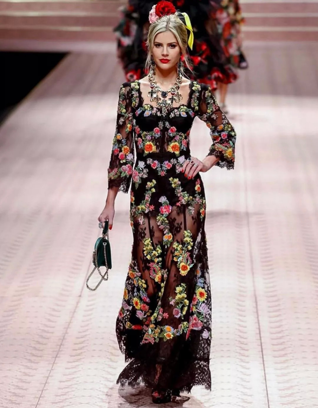 意大利式印花。意大利女人热爱大花,以D&G招牌式的印花为代表,多姿多彩的大朵印花简直是意大利式热情张扬的最佳注解。