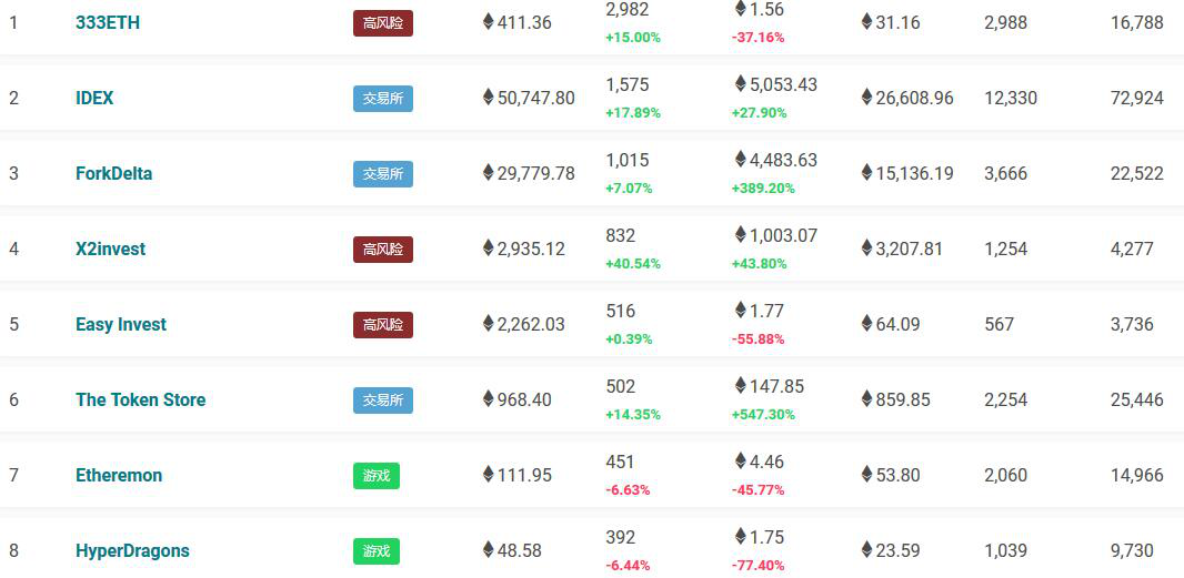 排名靠前的DApp中以游戏和博彩为主,加上高风险和交易所。在以太坊平台上排名前30的DApp中,共有9款游戏和12款高风险类别DApp。排名第一的333ETH即是这一类,根据英文描述,属于一种长期的理财应用,每天的回报率为3.33%。