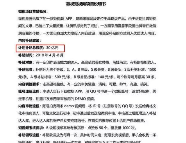 今年4月,一份《微视短视频项目说明书》的截图广泛流传,图中提到微视的补贴金额为30亿,主要用于扶持达人、支持内容创作。据界面当月的采访可知,抖音达人接一单活的市场均价约为三万,而微视最高的S级补贴是一条短视频1500元。