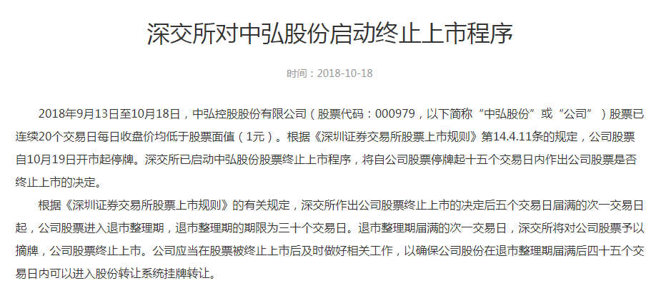 深交所在公告中称,已启动中弘股份股票终止上市程序,将自公司股票停牌起十五个交易日内作出公司股票是否终止上市的决定。深交所作出公司股票终止上市的决定后五个交易日届满的次一交易日起,公司股票进入退市整理期,退市整理期的期限为三十个交易日。退市整理期届满的次一交易日,深交所将对公司股票予以摘牌,公司股票终止上市。