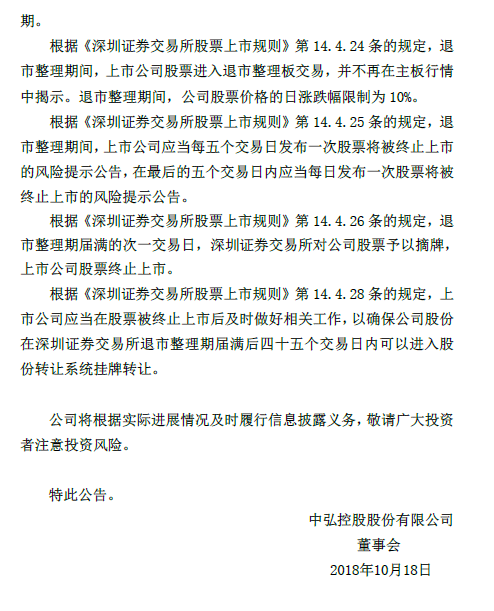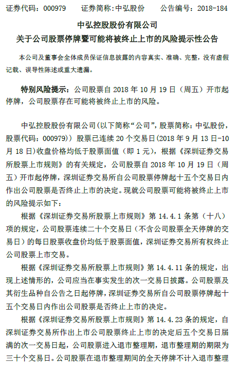 本周四,中弘股份发布风险提示公告,公告称公司自2018年10月19日(周五)开市起停牌,公司股票存在可能将被终止上市的风险。