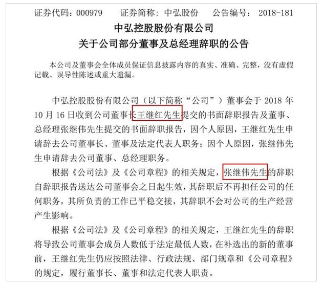 周二10月16日晚间,中弘股份发布公告称董事会收到公司董事长王继红及董事、总经理张继伟提交的书面辞职报告。两人均表示,因个人原因,申请辞去公司职位。同时一起发布的,还有《关于公司股票可能将被终止上市的第八次风险提示性公告》。而今年来已有5名高管接连辞职。