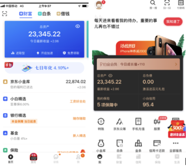 在布局上,旧版在顶部用财富、白条、借钱三个栏目,对应京东金融的财富业务、白条和借贷业务。新版将其功能移动底部,并用财富、信用、保险、生活来替代。从命名上亦可看出用户需求替代产品功能的描述方式。