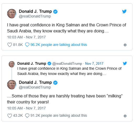 对于萨勒曼的“反腐行动”,特朗普在推特上表示高度肯定。他说:“我对沙特国王和王储有着极大的信心,他们很清楚自己在做什么。这次很多被严厉处置的人多年来一直在占这个国家的便宜。”