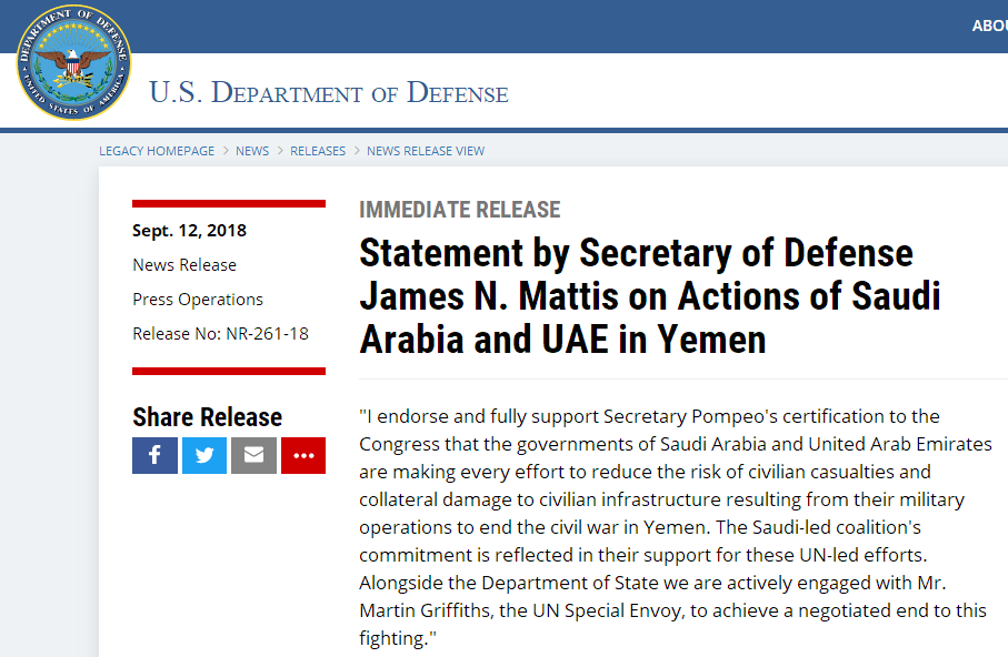 之后,美国国防部长马蒂斯对国务卿递交国会的“保证书”做了保证。他在官方声明中表示:“我对国务卿递交国会的保证书给予全面的支持。我认可沙特政府和阿联酋政府正在采取一切努力来减少也门军事行动中的平民伤亡。”