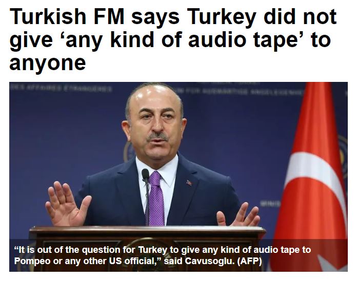 随着事件愈演愈烈,一项项指向沙特谋杀的疑似“实锤”被逐渐曝光。10月8日,土耳其当地媒体曝光了一段录音,其中记录了卡舒吉在沙特领事馆内被残忍肢解的过程。对此,阿拉比亚电视台(Al-Arabiya)在19日的报道中指出,土耳其外长已经否认向任何人提供任何录音。18日的另一篇报道则称,土耳其司法部长呼吁公众忽视卡舒吉案件中所谓“泄露的”信息。