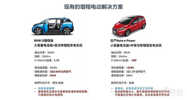 小排量发动机动力水平较弱,即发电功率小。在电池电量不足的时候,单靠发动机的发电功率无法让电动机全功率工作,车开起来动力会变弱,宝马i3增程版就有这个问题。