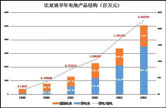 2002年7月,比亚迪在香港主板上市(代码01211.HK),募集资金16亿港元。上市后,锂离子电池出货量把镍镉电池远远抛在后面,1999年锂离子电池销售额仅为镍镉电池的14%,2004年达到226%。