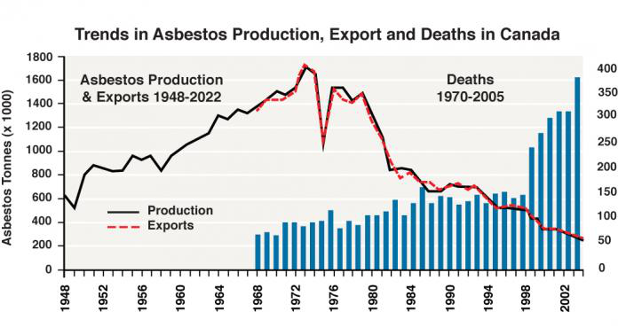 加拿大曾经是世界最大的石棉生产国。从1878年开始生产石棉,到1920年,产量已经占全球产量的85%。第二次世界大战结束后,加拿大仍然保持着全球石棉60%以上的产量份额。20世纪70年代初,随着欧美各国陆续限制使用石棉,加拿大石棉出口量持续下降,产量也随之缩减,由170万吨左右下降到20万吨以下。2010年左前后,加拿大石棉产量位居俄罗斯、中国、巴西和哈萨克斯坦之后,位居世界第五位。