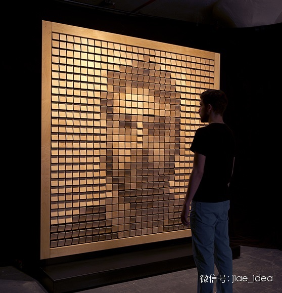 wood mirror同样也是一面神奇的镜子,830块木块会根据人的表情和动作进行运动拼出影像。木镜的运动可以达到每秒钟移动15次,翻转的动作平顺而流畅。