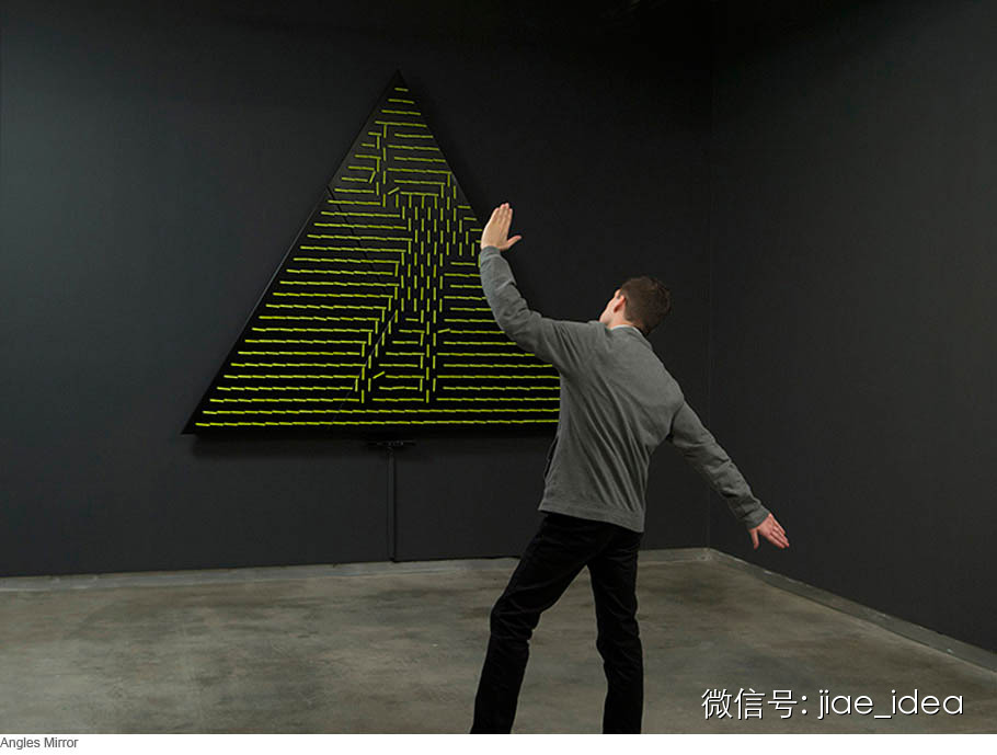 Angles Mirror是一个配有黄色的粗线的等边三角形,当人站在镜子前摆出动作时,这些粗线可以旋转,形成相应的图像。