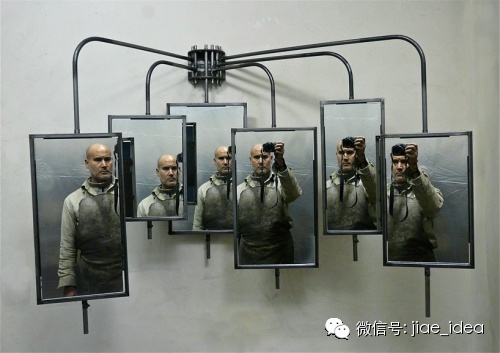 设计师 rafael gomez(就是镜中这位严肃大叔)把镜面按照不同角度进行摆放,每扇镜子会反射一个角度,这样你可以进行比对得知自己的最佳拍照角度。