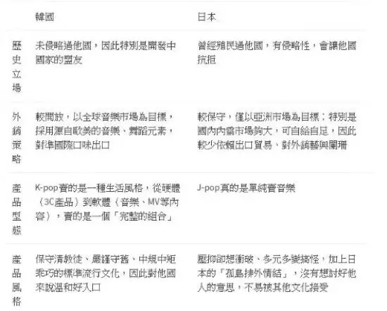 《韩流重袭》的作者洪又妮在比较K-Pop与J-Pop的特性之后,发现K-Pop的发展是由历史立场、外销策略、产品形态、产品风格等多方面条件促成的,而J-Pop并不具备这些条件。