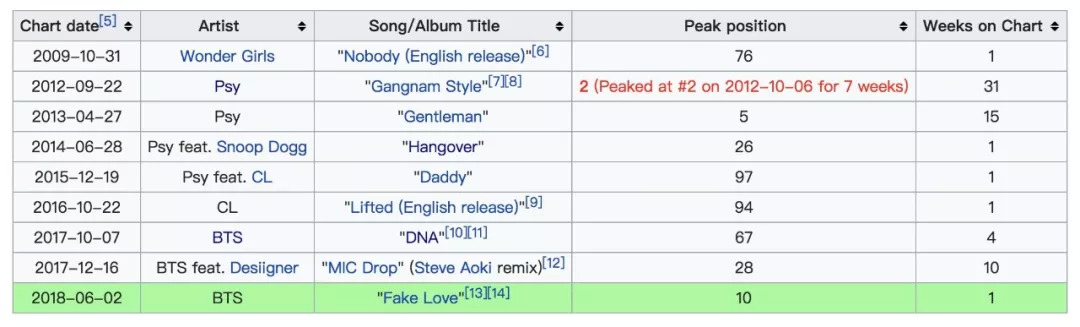 据了解,在公告牌 Hot100榜单上,K-Pop一共有9首歌入围,鸟叔(Psy)的《Gangnam Style》和《Gentleman》曾斩获第2和第5的好成绩。而C-Pop只有吴亦凡的《Like That》获得第73名,这已是C-Pop来之不易的重大突破。