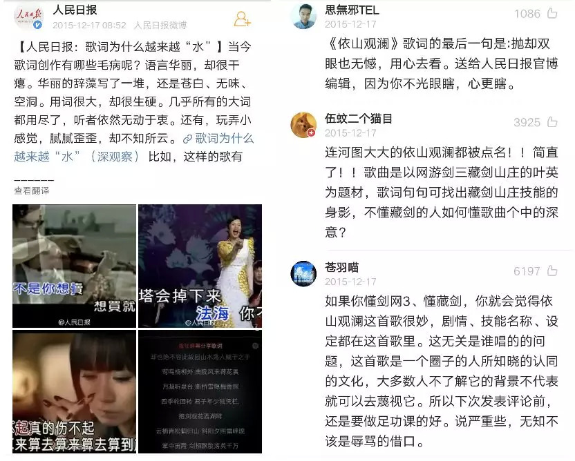 2015年,《人民日报》官微曾撰文批评歌词“注水”,只有空洞的华丽辞藻没有其丝毫内容,不知所云,其中配图就有古风歌曲《依山观澜》。