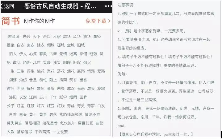 其中最为典型的代表是2016年,一位名叫@程序员Delton 的网友在简书上发布了名为“恶俗古风自动生成器”的代码,据说是从另一位网友对古风音乐圈的吐槽而获得的灵感。由这条微博引发的讨伐,成为了数年之后古风音乐被提及的普遍印象。