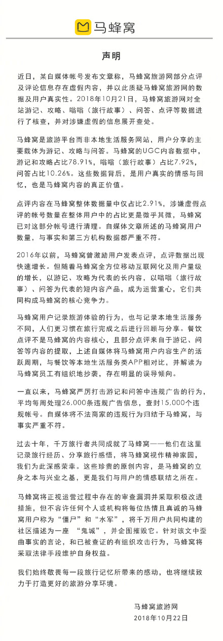 针对“点评多数为抄袭”事件的质疑,马蜂窝今早发布声明,称对全站游记、攻略、嗡嗡(旅行故事)、问答、点评等数据进行了核查,并对涉嫌虚假的信息展开查处。马蜂窝表示,点评内容在马蜂窝整体数据量中仅占比2.91%,涉嫌虚假点评的帐号数量在整体用户中的占比更是微乎其微,马蜂窝已对这部分帐号进行清理。自媒体文章所述的马蜂窝用户数量,与事实和第三方机构数据都严重不符。马蜂窝还表示,针对自媒体文中歪曲事实的言论,和已被查证的有组织攻击行为,将采取法律段维护自身权益。