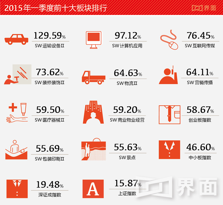 从大的板块来看,根据申万二级行业分类,第一季度运输设备板块、计算机应用板块,板块指数整体上达到了一倍的增长,军工航天,高铁动车,汽车三部分大大提振了该板块。计算机应用板块的涨幅也接近100%,大数据、云计算从基础建设期进入行业应用期,而信息安全也被提升到国家战略角度,给了计算机板块主题性的投资机会。而借助“互联网+”的风口,互联网传媒板块也上涨了76.45%。