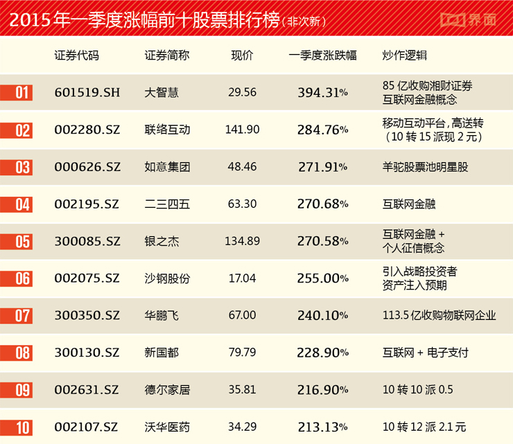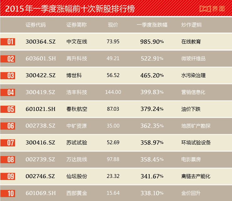 除开涨幅惊人的次新股,以下这10只股票在第一季度也取得了不错的成绩。