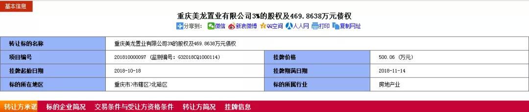 10月18日,重庆联交所发布公告称,重庆市蔡家组团建设开发有限公司拟挂牌转让重庆美龙置业有限公司3%的股权及469.8638万元债权,挂牌价为500.06万元。