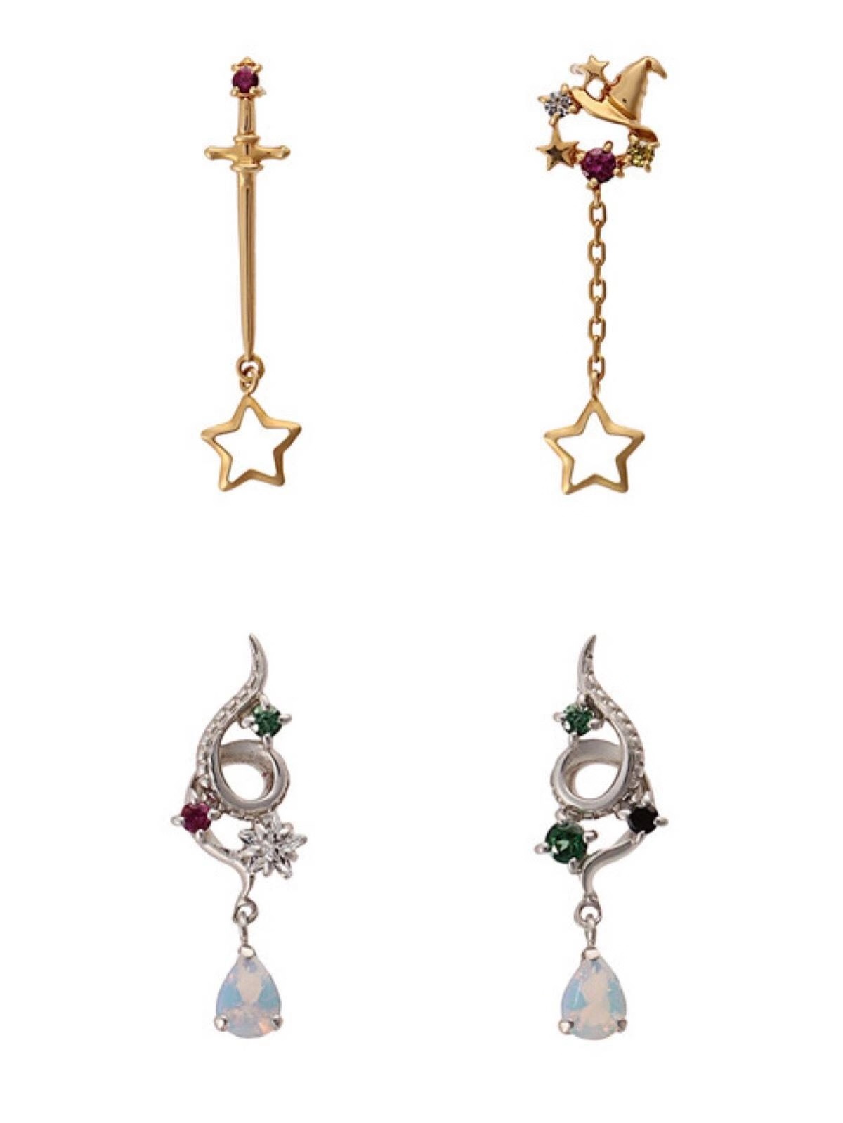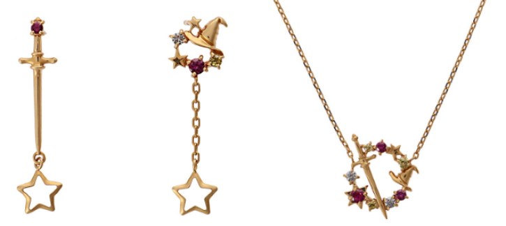 项链和耳环上有斯莱特林的蛇标识或哈利波特的闪电标识,以及分院帽和格兰芬多宝剑图案等。项链和耳环上面还镶有红宝石,非常精致。