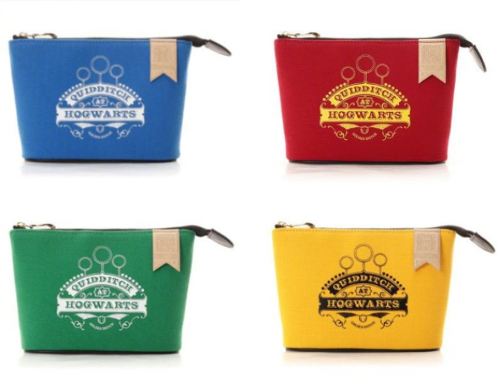 先从包看起,从手提包、单肩包、钱包到双肩包,几乎涵盖各种类型。每种包包都有红黄蓝绿四个颜色,分别代表格兰芬多、赫奇帕奇、拉文克劳和斯莱特林——霍格沃魔法学校的四个学院,上面印有学院的标识。单肩包的中间位置有每个学院的院徽及学院名字做成的金属扣,手拿包则把每个学院的魁地奇球门印在包包上,钱包印有学院围巾的颜色,连包包内袋都是卡通的学院图案。