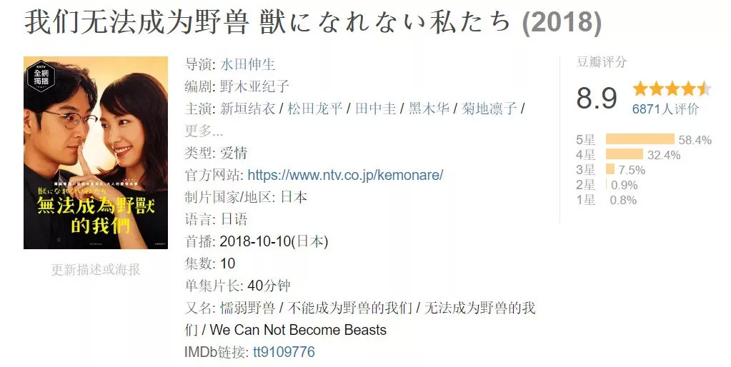 众所周知,日剧的“丧”总能拍得深入人心,而这部《我们无法成为野兽》的编剧和此前大热的《重版出来》、《逃避虽可耻但有用》都是同一人。