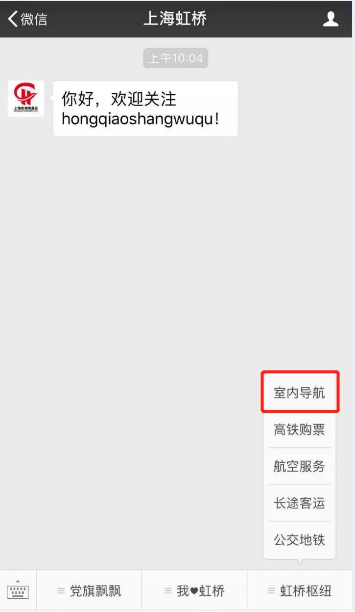 关注“上海虹桥”微信号,进入主菜单页面,点击“虹桥枢纽”,选择“室内导航”,进入界面。点击右上角“搜索”,选择好起止点之后,电子地图会通过智能路算计算出最优化路线指引您到目的地。