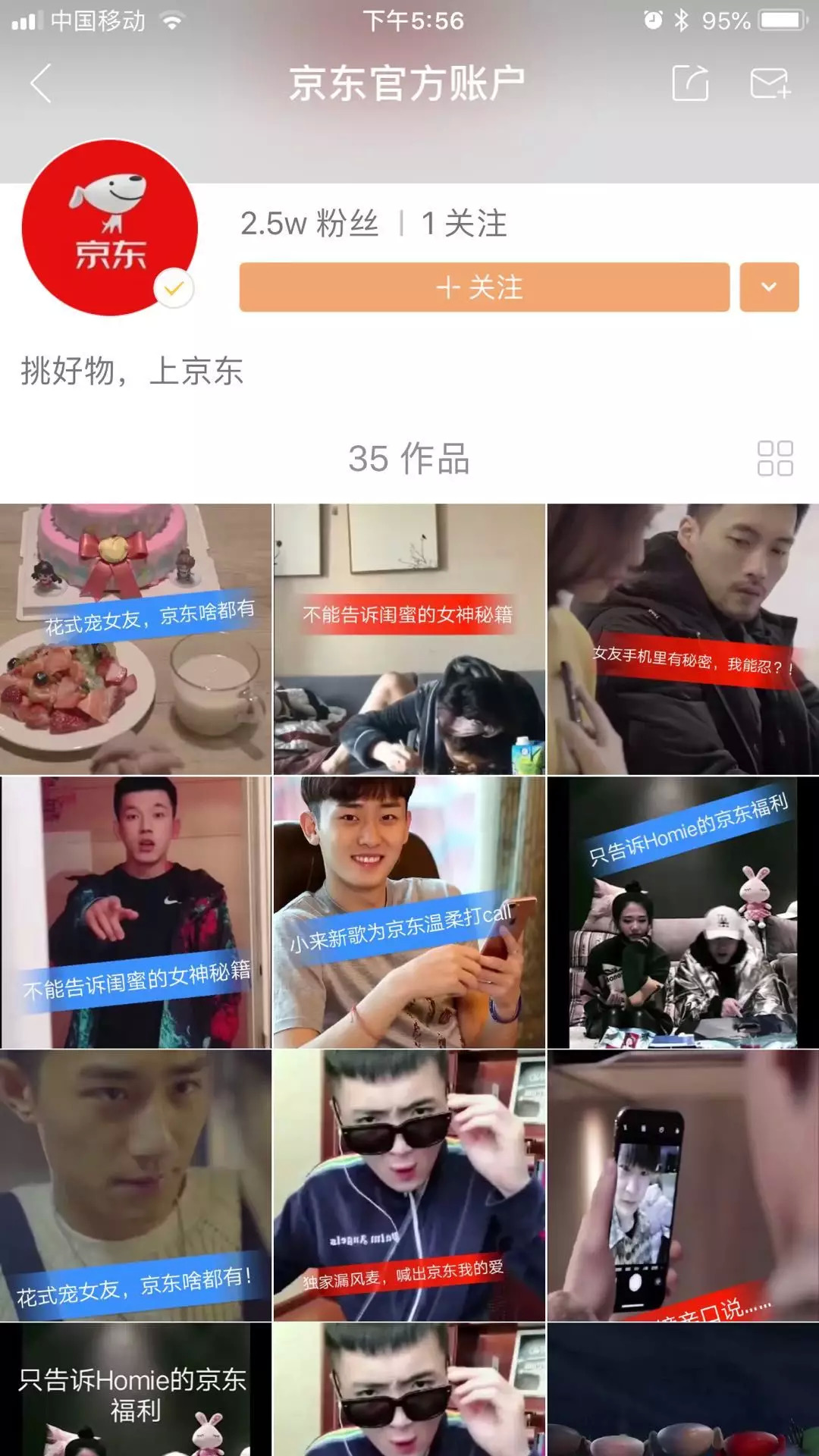 如果时尚品牌在快手上做营销将会是什么场景?这个场景没法想象,至今也没见到官方时尚品牌入驻快手,如果你翻一翻快手上的企业品牌,你可能会翻到京东,京东在快手上的短视频营销与其他平台调性完全不同,它有着一股浓浓的乡土气息,这是京东在向审美降级妥协吧。