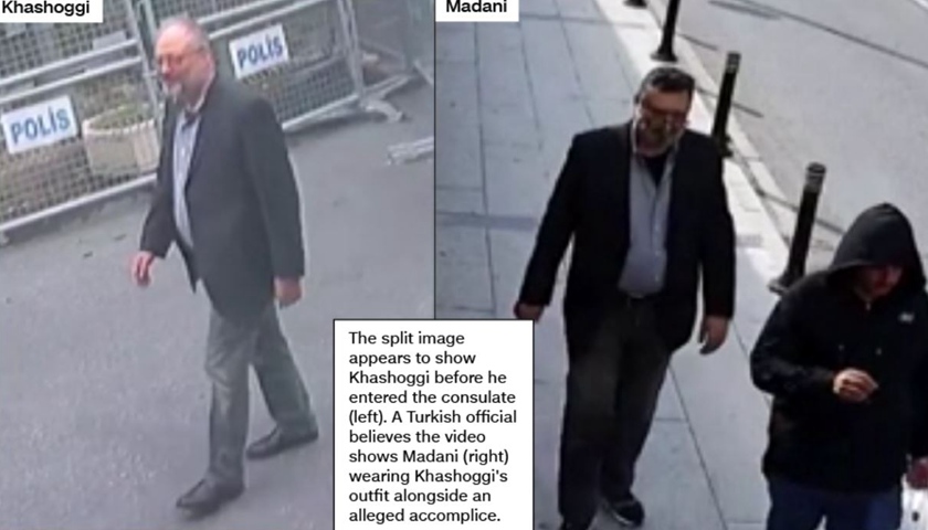 在卡舒吉进入领馆后不久,该男子身穿卡舒吉的西服衬衫、戴着眼镜、贴着胡子与同伴从领馆后门走出。但他脚上依然穿着进入领馆时的帆布鞋。当天,卡舒吉的未婚妻曾被警卫告知,卡舒吉可能从领馆后门离开。