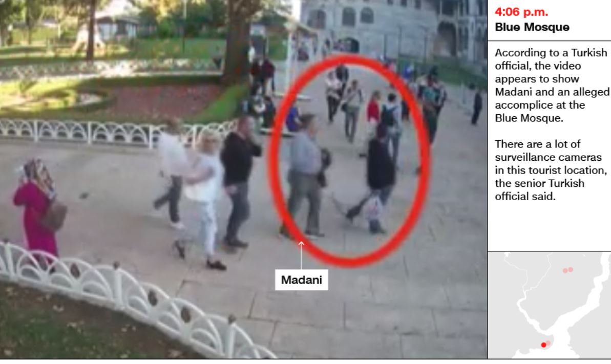 土耳其官员称,视频中拍摄的男子为57岁的马达尼(Mustafa al-Madani),是15人暗杀小组中的一员。入境记录显示,马达尼于2日早上3点37分抵达伊斯坦布尔阿塔图尔克机场。