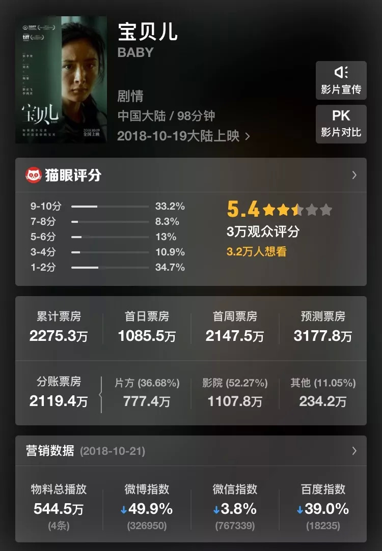 有着超高期待值的《宝贝儿》,在10月19日重磅登场,却遭遇了市场寒流。从上映首日排片第一,到如今的被《影》《找到你》《嗝嗝老师》逆袭反超,票房口碑齐跳水的《宝贝儿》最终没有撑过首周。