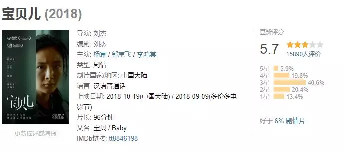 还需要注意的是,《宝贝儿》还曾在国际影展频频亮相,“墙内开花墙外香”正是刘杰作品的一贯品性。在圣塞巴斯蒂安,刘杰带领杨幂、郭京飞踏上红毯,国际A类电影节主竞赛单元作品,至少证明了其内容的可靠;而多伦多电影节特别展映单元,也得到了海外影评网站的点赞,IMDb与烂番茄都曾给出好评。