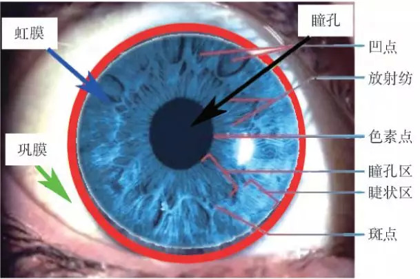 人的眼睛外观由巩膜、虹膜和瞳孔 3 部分构成。虹膜是位于巩膜和瞳孔之间的环形区域,约占眼睛总面积的65%,虹膜包含了丰富的生物学特征信息,而且在幼年固定下来后维持终身不变,可以说是一个人的终身身份证(3)。