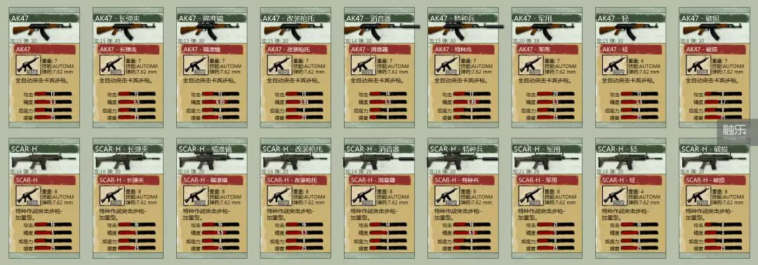 图为贴吧网友wtmdsyx整理的《联合城》全武器图鉴中的一部分,可以看到武器种类非常丰富,仅一把步枪就拥有9种不同形态,属性也各不相同