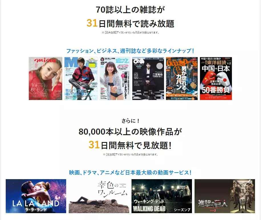 U-NEXT每月费用为1990日元,但除了杂志和漫画外,会员还可享受包含8万部电影和动画在内的综合娱乐内容。另外,这1990日元会费还含可用于购买视频、漫画的1200日元积分,用户可使用这些积分来购买喜欢的商品。