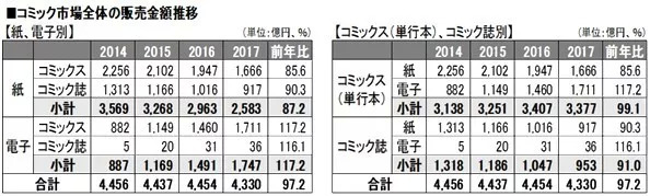 日本纸质漫画出版的不景气状况已出现多年,销售额连年走低。据出版科学研究所公布的2017年度漫画市场业绩统计,2017年日本漫画市场销售额继续下滑,纸质书和电子书总销售额4330亿日元,较去年下降2.8%。其中,纸质书市场下降12.8%(纸质单行本下降14.4%,纸质杂志下降9.7%)。