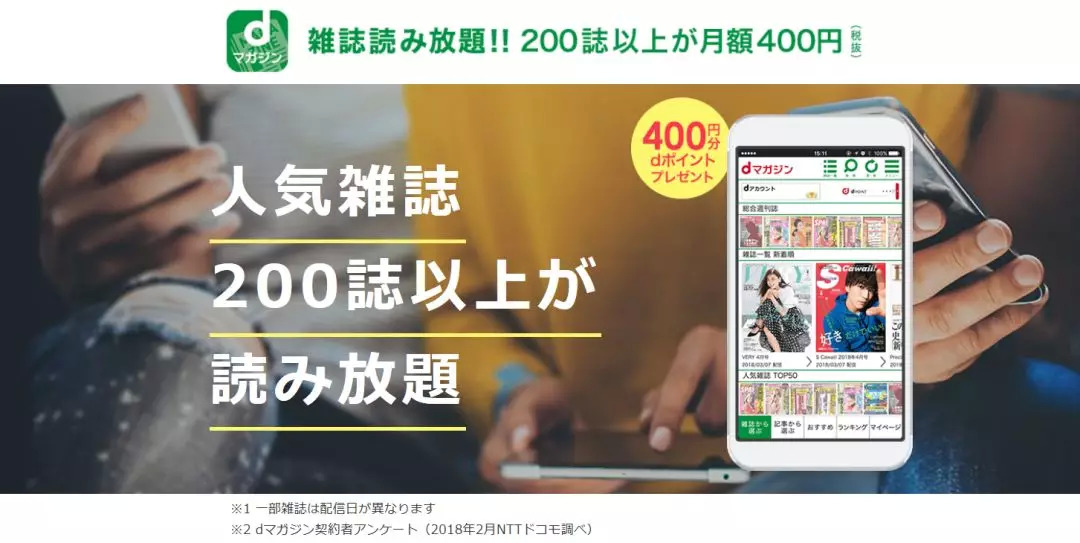 另外,由株式会社NTTドコモ运营的dマガジン服务也与此类似。即使不是docomo智能机用户也可以使用。月费为400日元,用户可以获得《SPA》和《週刊朝日》等超过200种杂志的最新号。该服务还包含1500册以上的往期杂志,可供信息检索。