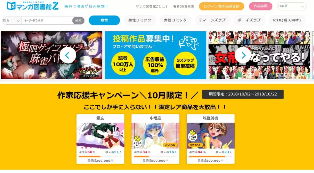 而由株式会社Jコミックテラス于2015年11月运营的“漫画图书馆Z”同样是可以为读者提供免费漫画,但是会弹出广告。漫画图书馆Z上不仅可以看到专业漫画家的作品,还可以看到将来有望成为漫画家的业余爱好者的作品。该平台上的内容主要是过了版权期的老漫画,以及单行本化了的漫画家的作品,总共约5000部以上的作品。支付额外费用300日元,则可去广告,也可以看成人向的作品。