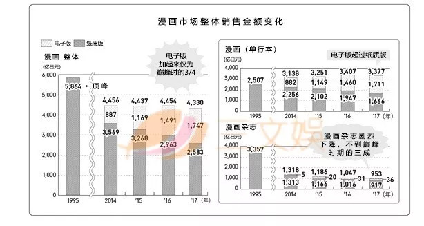 但与此同时,电子漫画逆流而上,实现了明显增长——电子单行本2017年同比上涨17.2%,同时,其销售额首次超越纸质单行本。