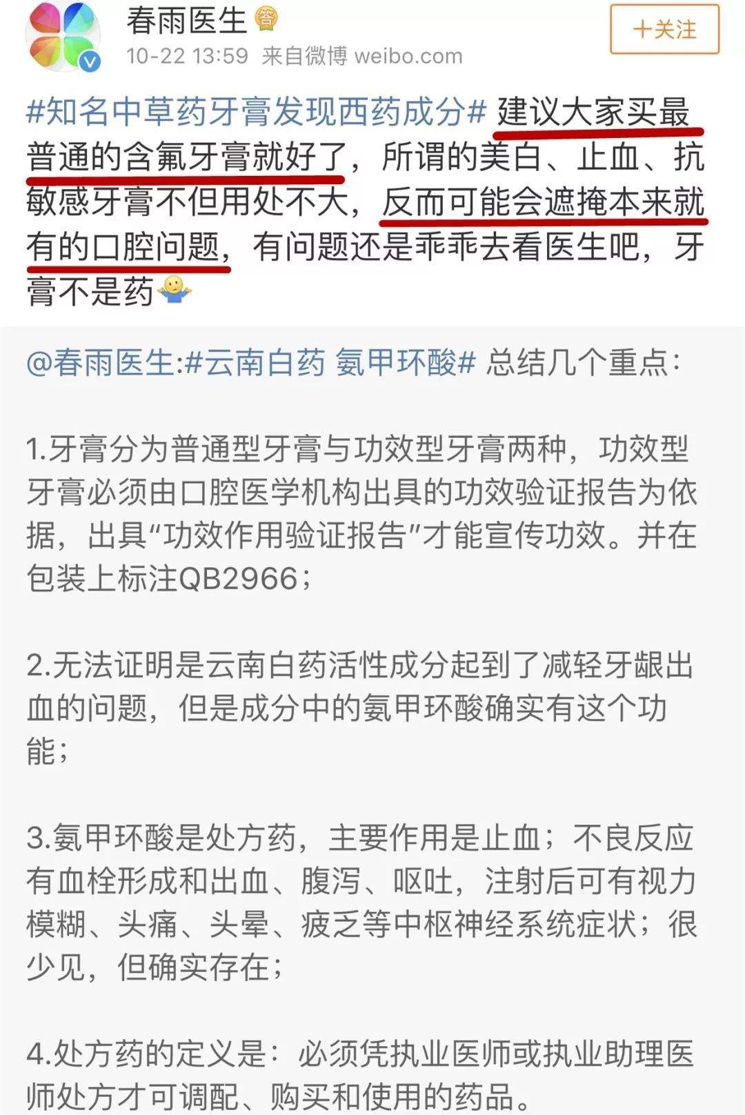 据媒体报道,近日,名为“科普医生博雅”的某医院血液科医生在微博上爆料,称在超市买牙膏时发现云南白药牙膏的成分表中含有西药成分氨甲环酸。