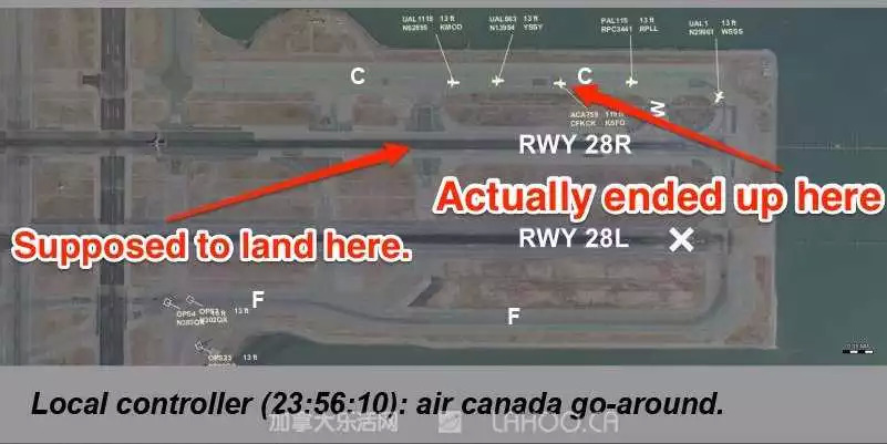 这宗事故发生在2017年7月7日近午夜时分,由多伦多起飞的加航AC759航班被准许在旧金山国际机场的28R号跑道上着陆,但机长在着陆时没有进入预定的28R,而是朝与28R平行的Taxiway C滑行道降落,这条滑行道上已经有四架飞机排成一行,正准备起飞。