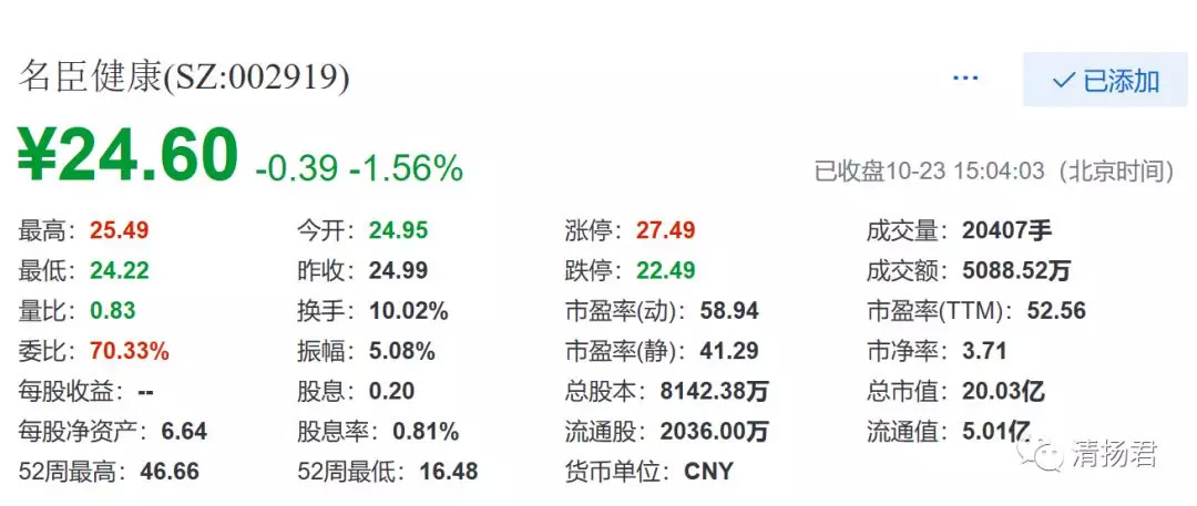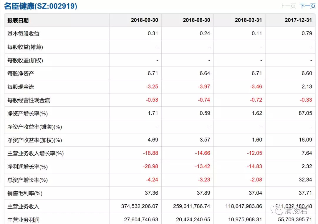 事实验证了清扬君的判断。名臣健康2017年12月18日上市,除了首个财年报告缓慢增长外,其他三个季度业绩都在下滑。名臣健康上市后四个季度(2017年第四季度、2018年前三季度)主营业务收入增长率为7.64%、-12.05%、-14.66%和 -18.88%,同期净利润增长率为2.32%、-14.8%、-13.42%、-28.98%,同期总资产增长率为32.34%、-2.08%、-3.23%、-4.24%。